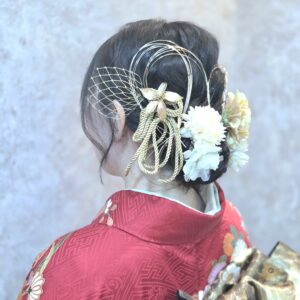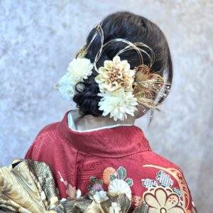 ​「どれを選んでも、何個つけてもOK」なので、お着物の雰囲気に合わせて、ボリュームたっぷりの華やかなスタイルが完成しました。