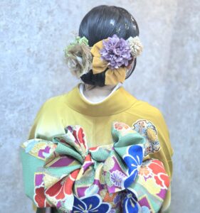 振袖の古典的な美しさを引き立たせるよう、バランスを考えながら飾りをデコレーション。