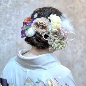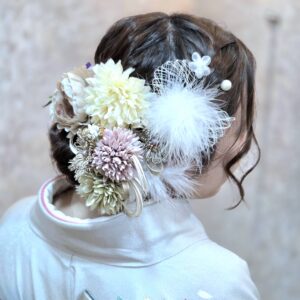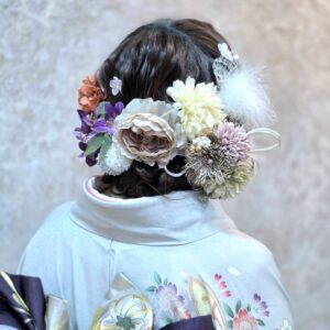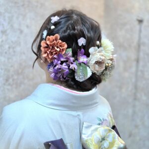 当店の髪飾りつけ放題では、振袖の色合い(グレーや紫)を大切にしながらも、お嬢様が好きな「可愛らしさ」をたっぷり詰め込んだ髪飾りをチョイスしました。