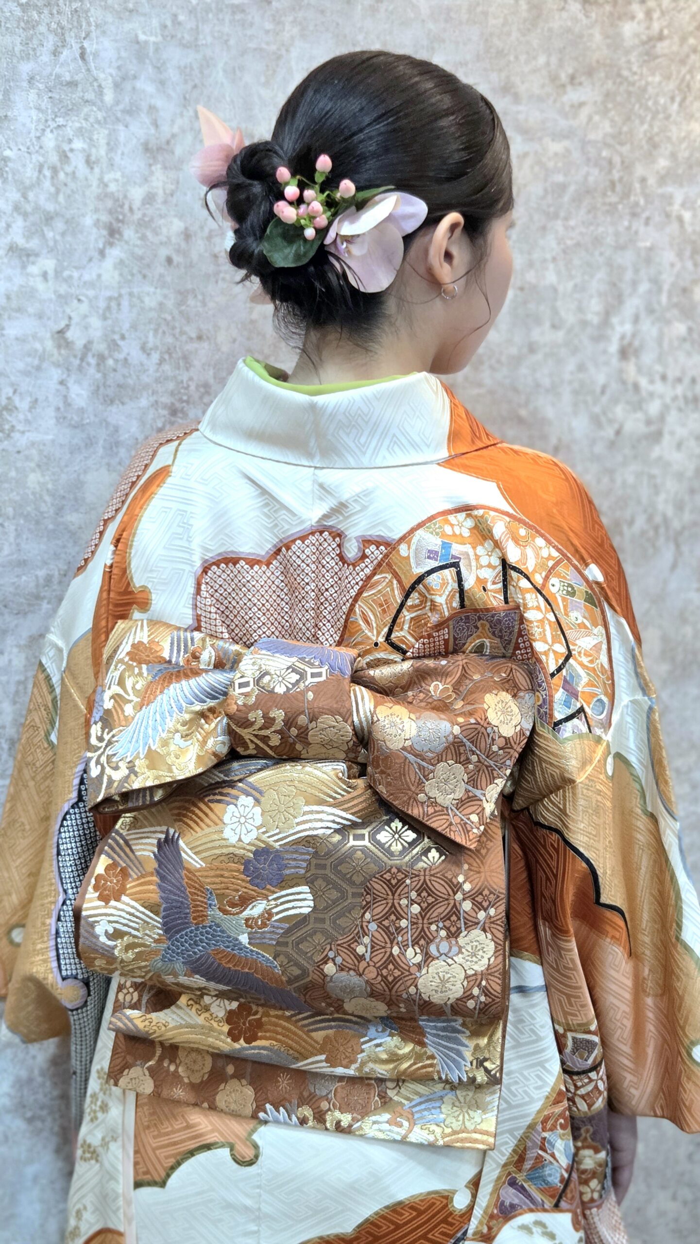 Point: 帯結びは、伝統的なお太鼓の安心感と、上部のリボンのひだの華やかさを絶妙なバランスにしました。お母様の振袖のクラシックな柄行きともマッチしています。「ここがいい」と選んでくださったお父様、本当にありがとうございます!
